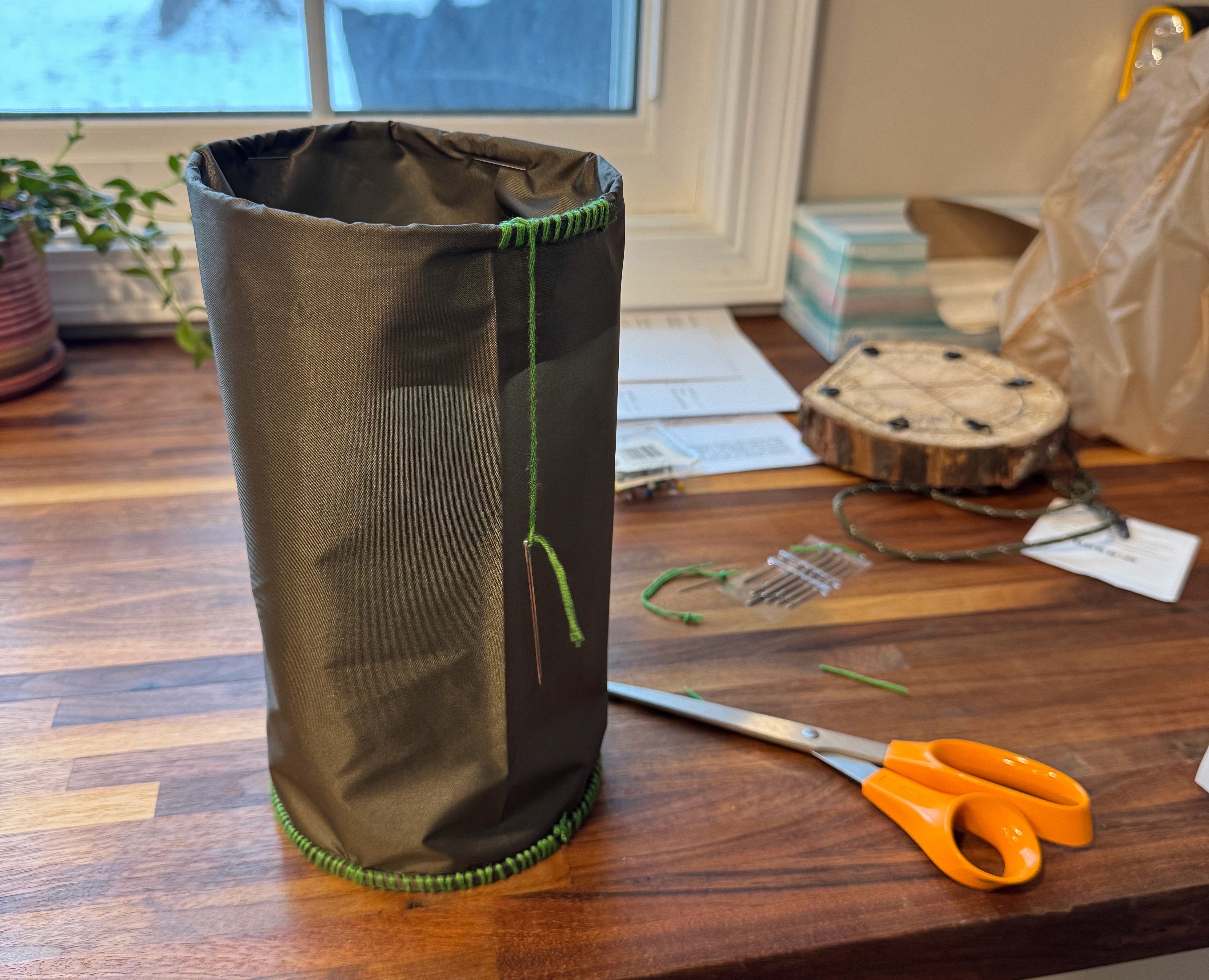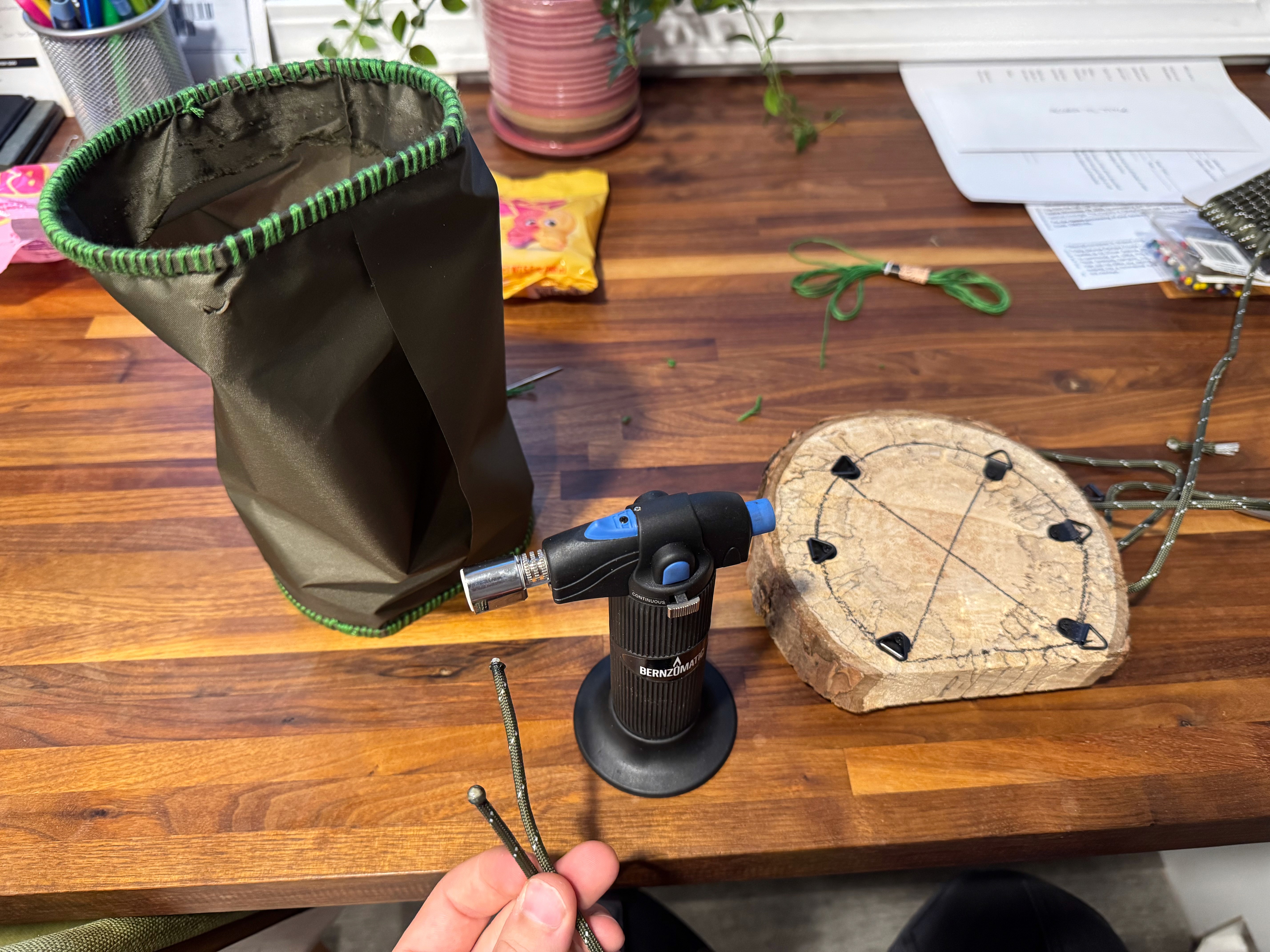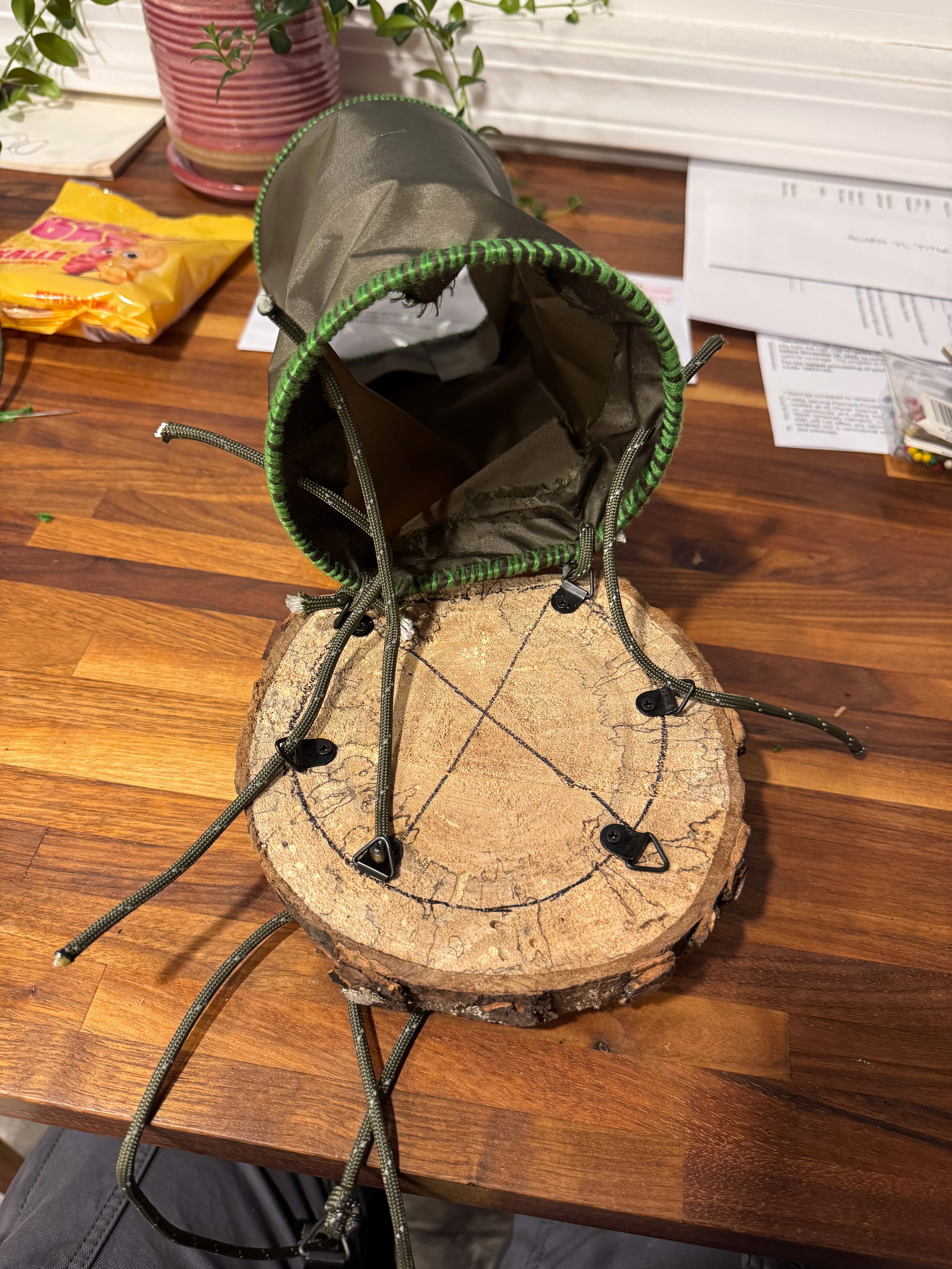 Dematerialization coincides with Patagonia and their processes of renewable resources, all wood was re-used from a cut down Oak tree. The main body fabric was Up-cycled from a a Patagonia jacket and the paracord was recycled from prior projects .