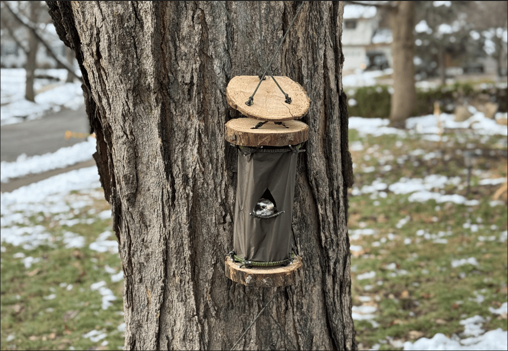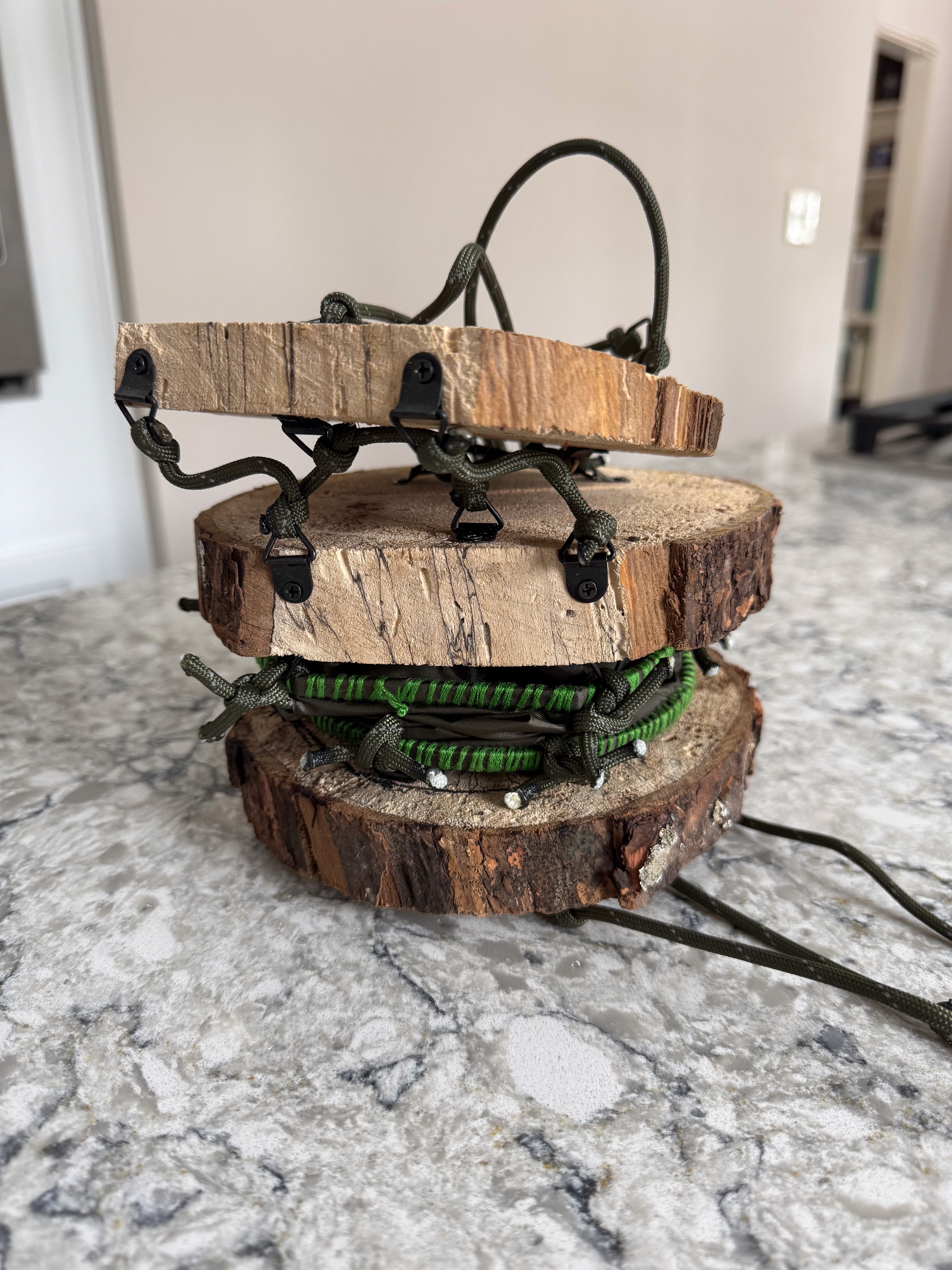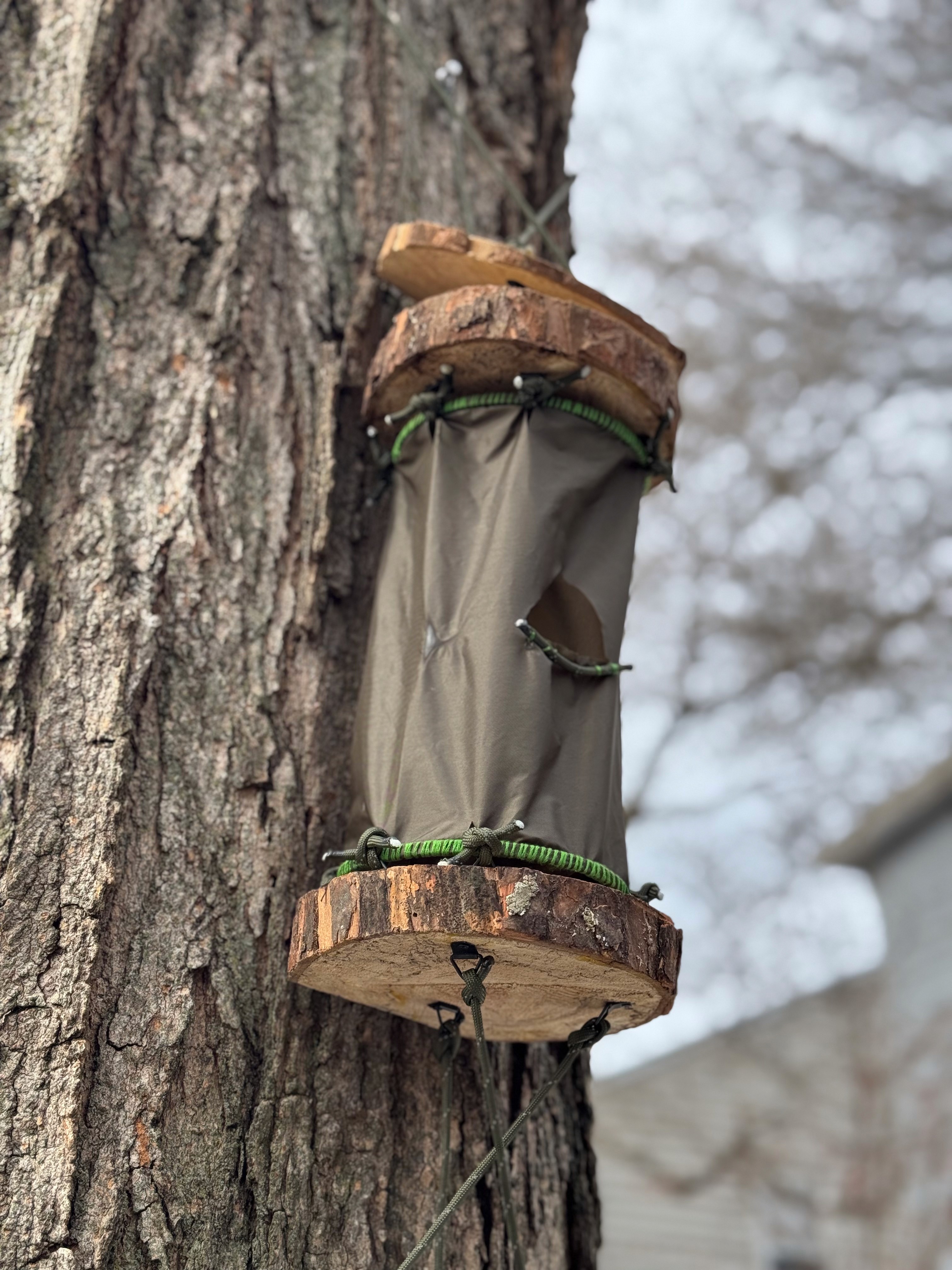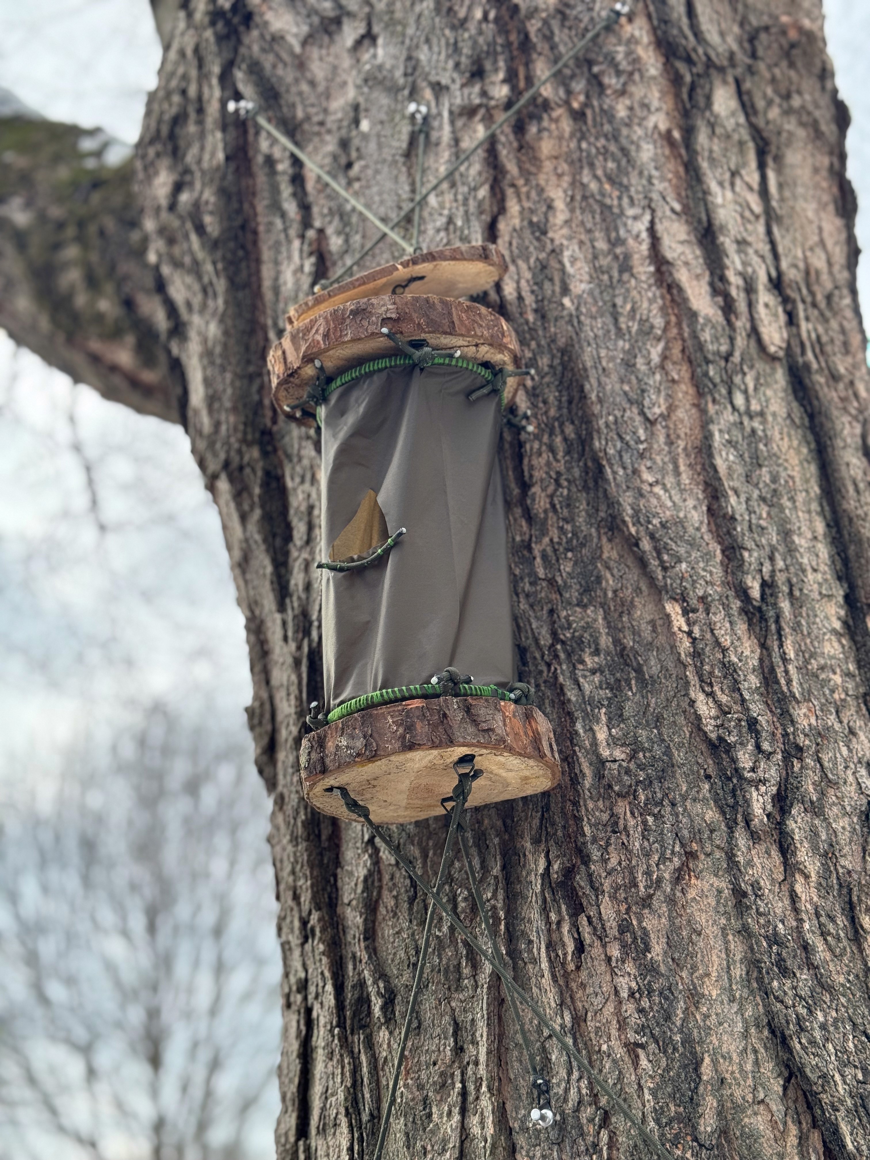 Designing for Patagonia and the Pacific Downy woodpeckers, the down house was created! Created from Re purposed wood log rounds, cutaways from a upcycled patagonia jacket as well as re cycled paracord